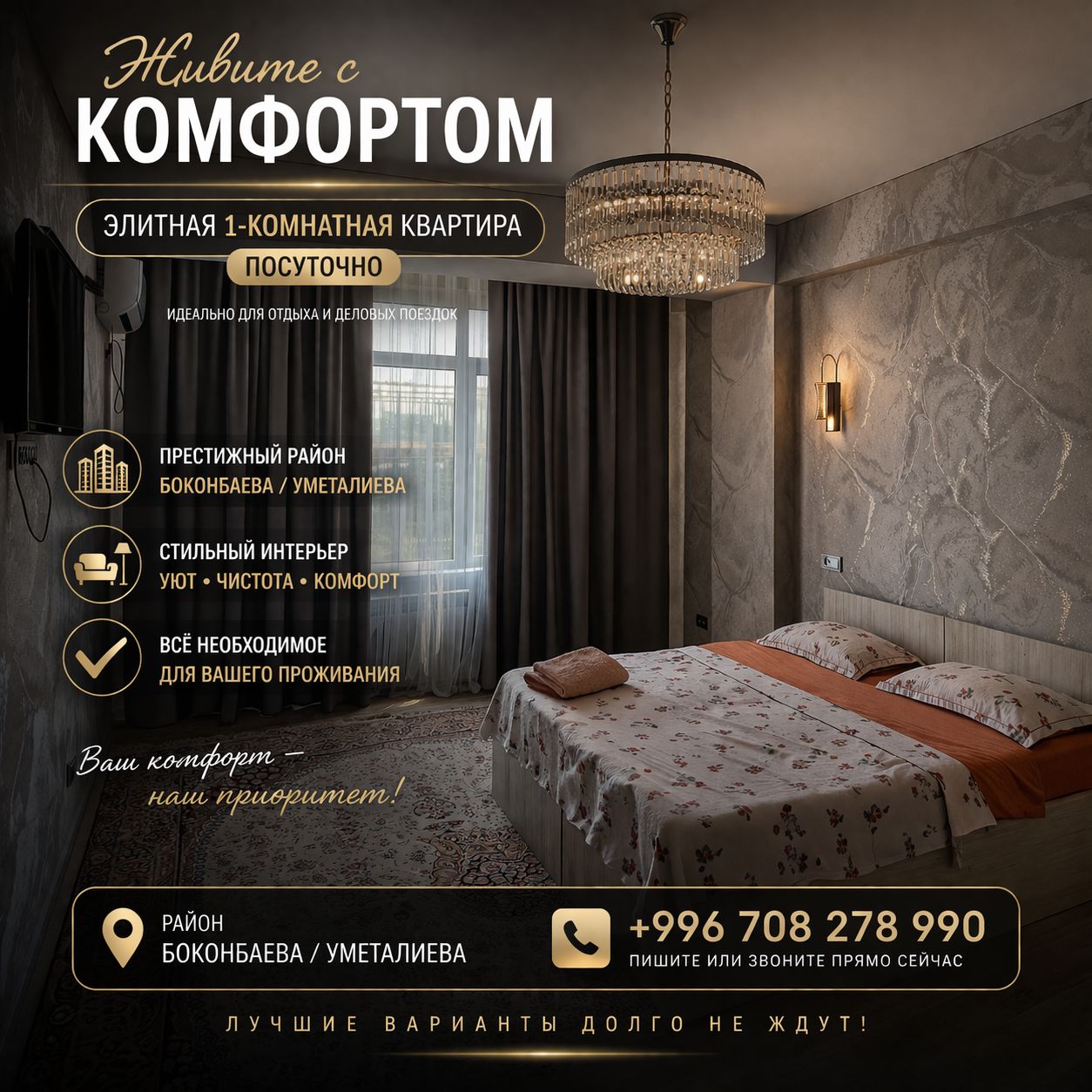 Цена: ночь от 3000 сом, сутки от 3500 сом